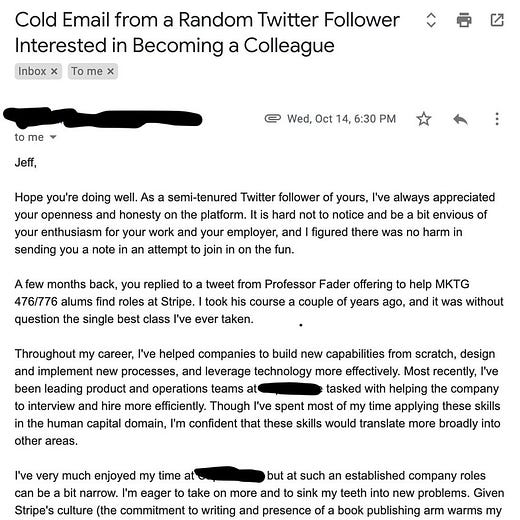 Also, perhaps worth thinking about too, is reaching out to senior individuals vs middle management - think founders and then the rest of the team. Yes, founders, VPs, Directors are busy. And that's why most people usually don't reach out to them with quality. But, and big but, they are usually quite open to business/parternship/hiring opportunities that if they don't have time to hear you out, they will intro you to someone else in the organization.